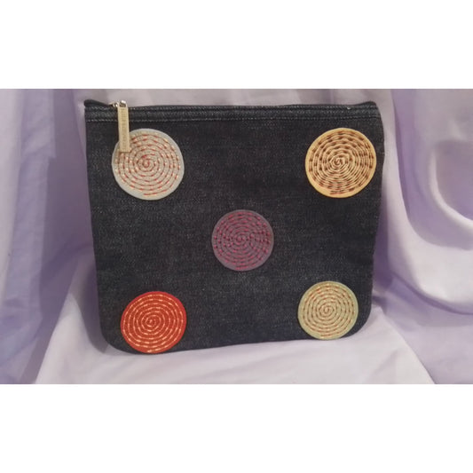 Bath & Body Works Denim Cosmetic Makeup Pouch Bag Spiral Embroidery Design