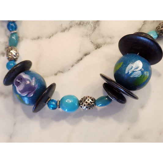 Blue & Black Beaded Necklace With Hand-Painted Floral Beads