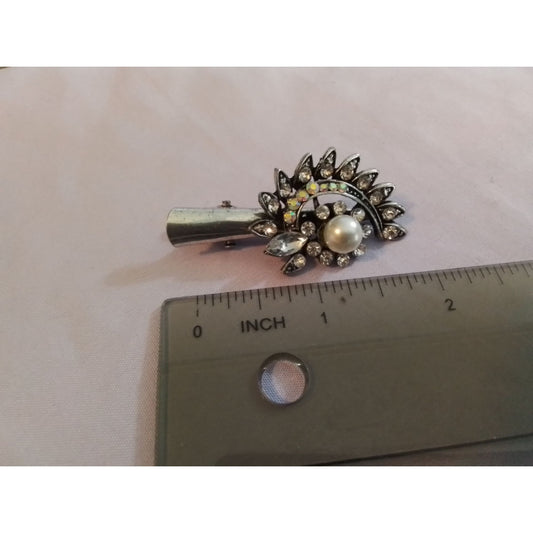 Vintage Rhinestone & Faux Pearl Floral Hair Clip Barrette Silver Tone, Elegant