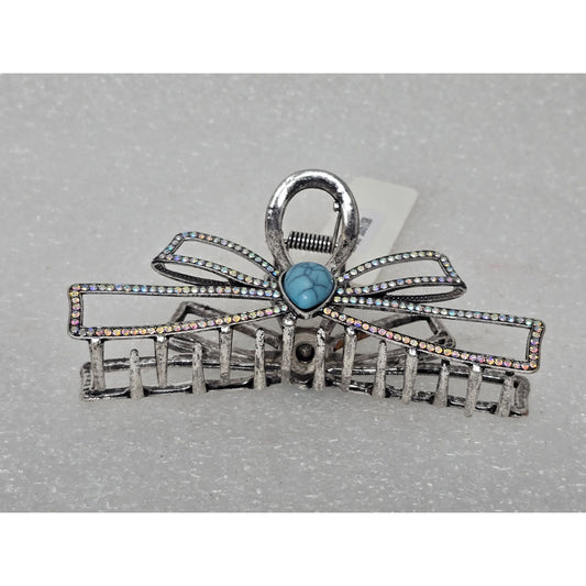 Large Silver Tone Hair Claw Clip With Rhinestones & Faux Turquoise Centerpiece