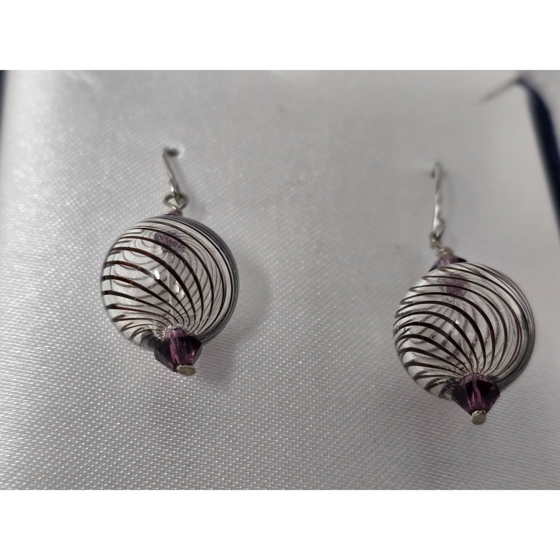 Handcrafted earrings feature sterling silver and handblown artisan glass with purple accents, offering a sophisticated touch for elegant and professional wear.