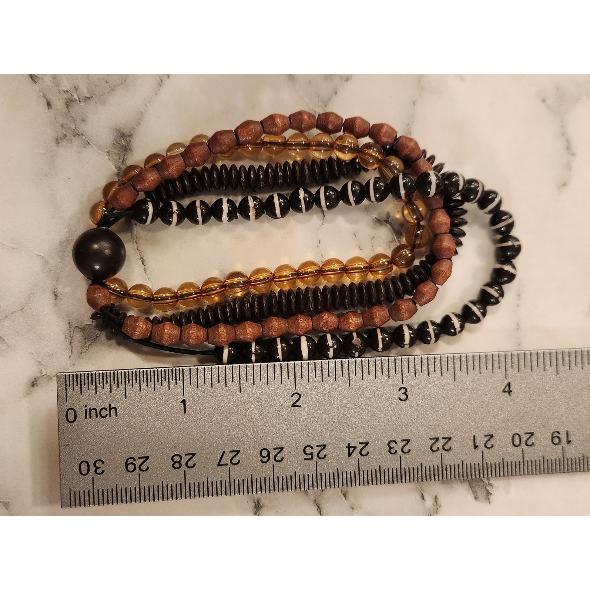 This bracelet set features a blend of wooden, amber, and black beads, offering both durability and a sophisticated look. A versatile choice for accessorizing.