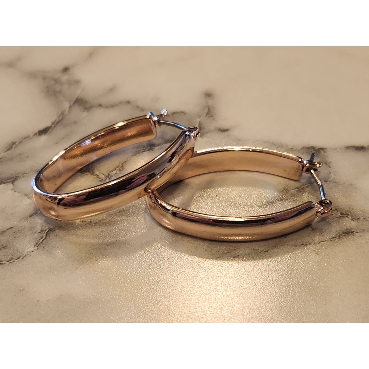 These gold-tone oval hoop earrings blend timeless elegance with modern style, suitable for enhancing both professional and casual outfits.