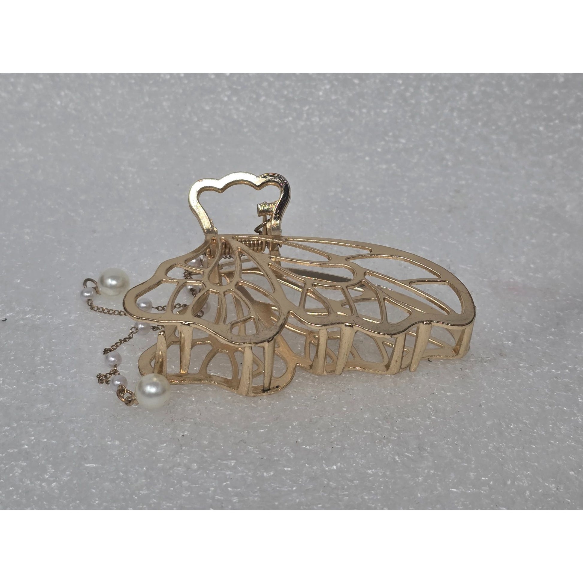 A sophisticated hair accessory designed for secure and stylish hair management. Features a butterfly design, gold finish, and faux pearl-chain embellishments.