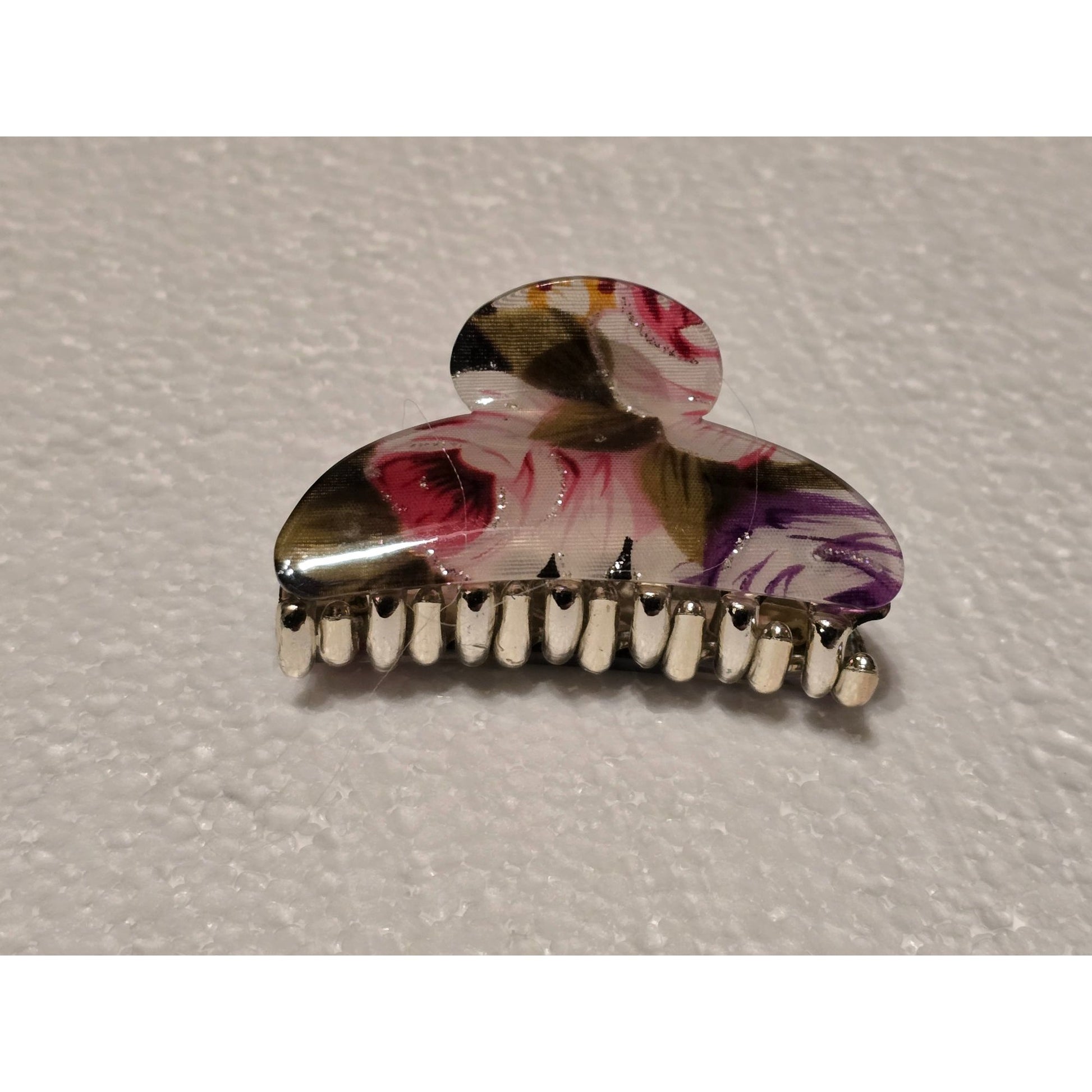 Stylish and functional hair claw clip featuring a floral design. Perfect for securing hair with a durable spring mechanism and metallic accents.