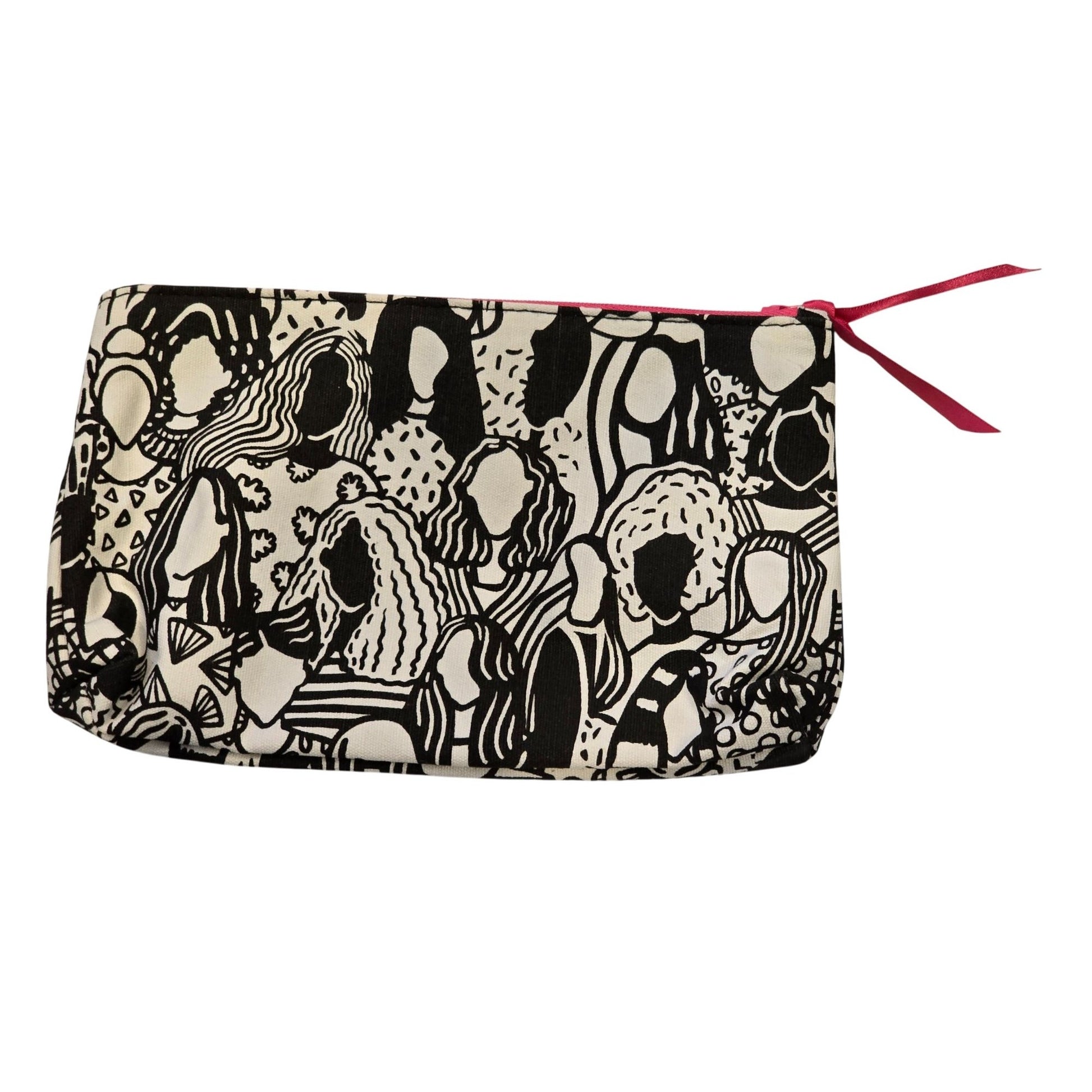 Ipsy Makeup Cosmetic Bag Black & White Abstract Faces With Pink Zipper & Ribbon