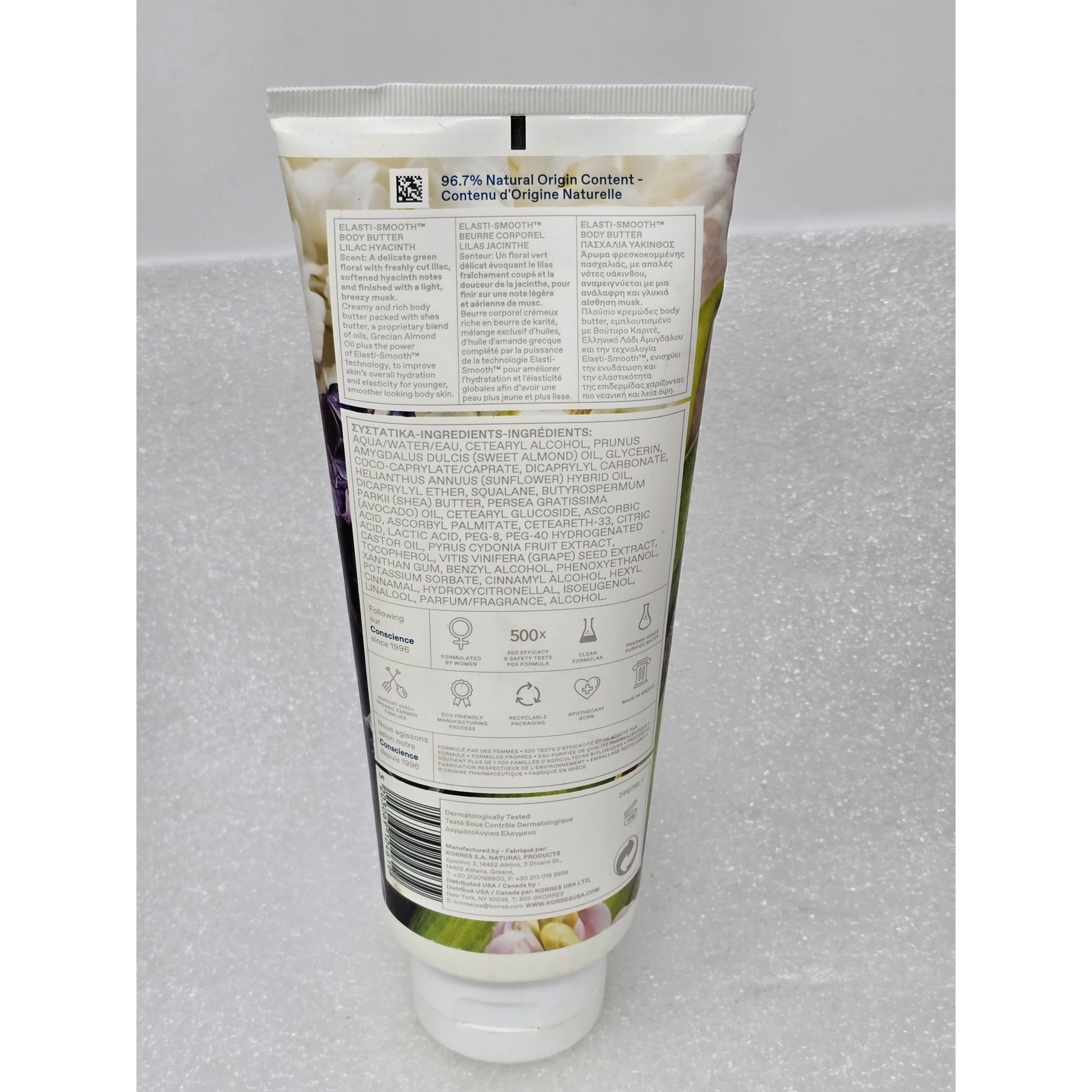 Korres Elasti-Smooth Body Butter offers deep hydration and smooths the skin with a 96.7% natural origin content. Infused with lilac hyacinth, it nourishes effectively.