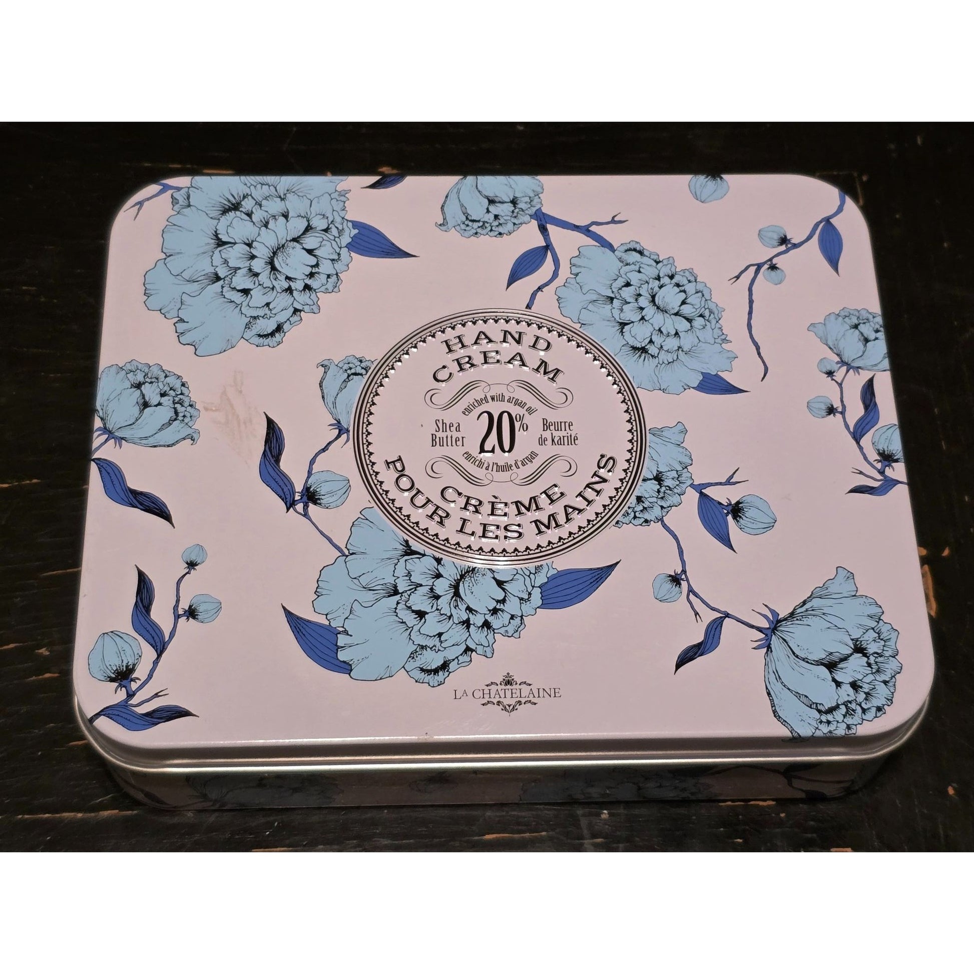 A luxurious hand cream set enriched with 20% organic shea butter, providing hydration and intensive repair. Packaged in a reusable floral tin.
