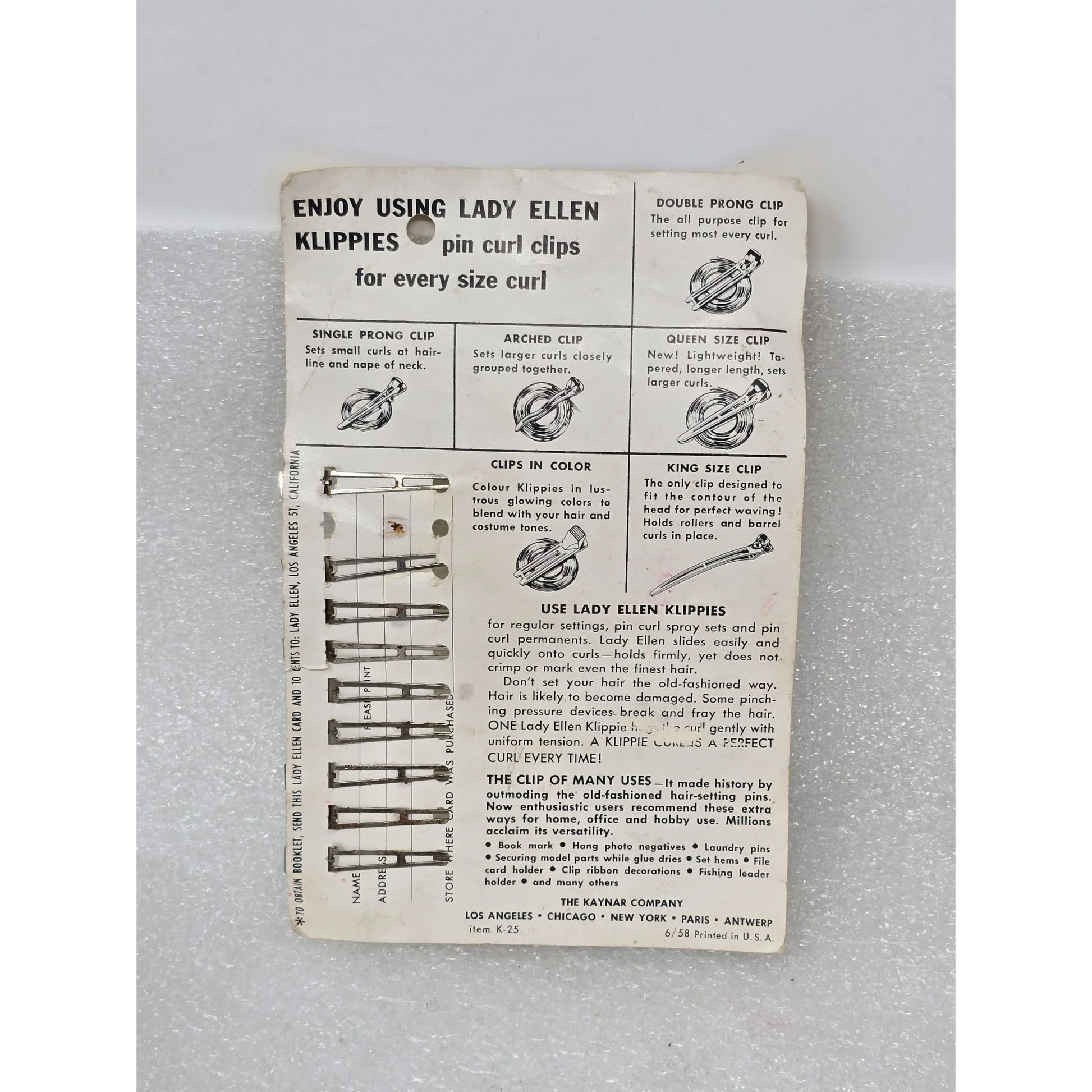 These vintage Klippies by Lady Ellen provide an authentic styling accessory for creating pin curls effortlessly. Ideal for achieving a classic Hollywood look, these single prong clips are safe with permanent wave solutions, ensuring no crushing or crimping. Embrace timeless beauty with this rare find.