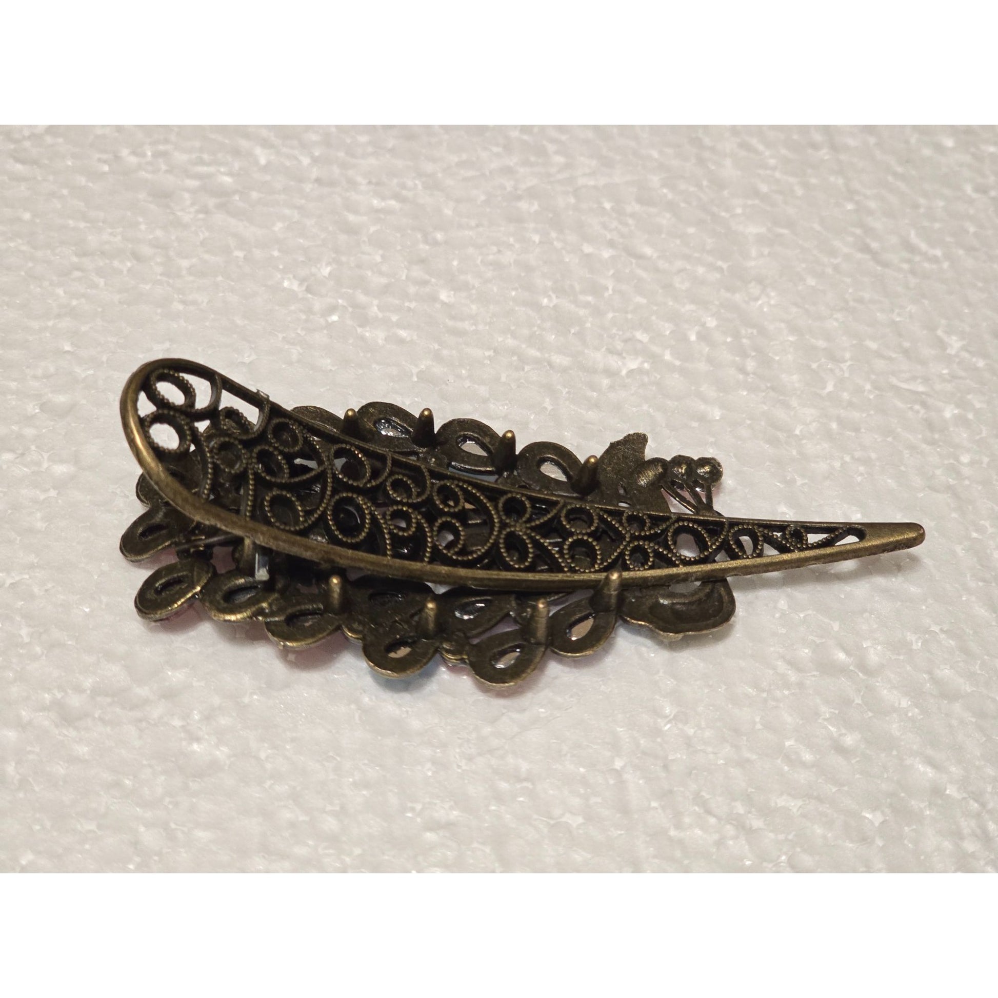 Elevate hairstyles with this intricately designed peacock hair clip. Its antique gold finish and vibrant gemstones add sophistication to any ensemble.