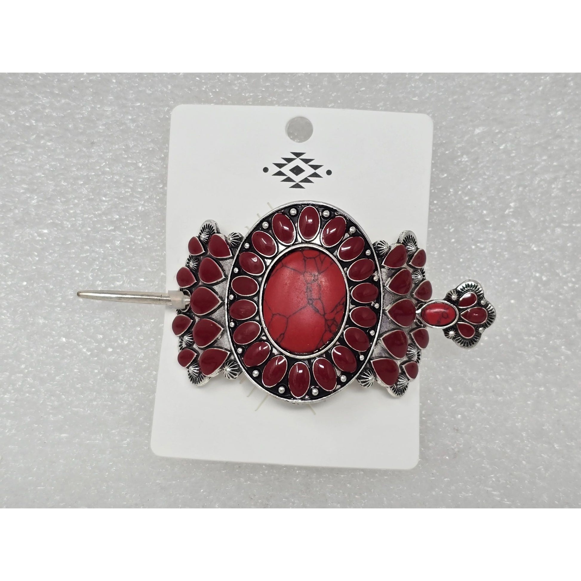 This intricately designed hair pin barrette showcases a vibrant red centerpiece surrounded by a silver tone setting. Crafted with attention to detail, it adds a touch of Southwestern flair to any hairstyle, making it an ideal accessory for enhancing attire with a unique and stylish twist.