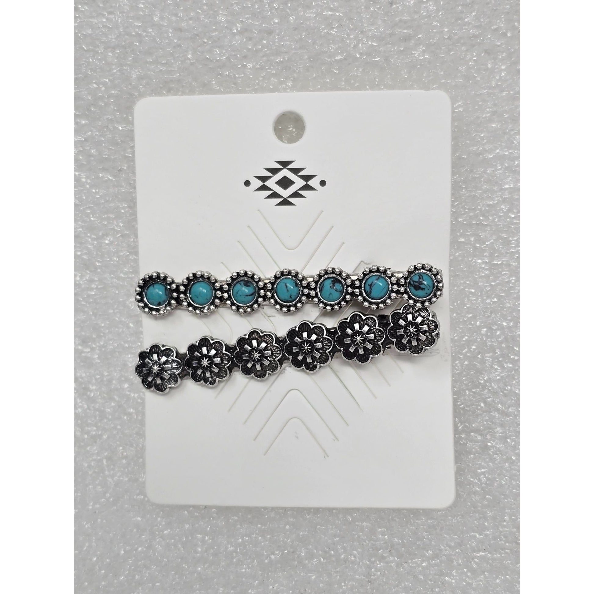 Crafted with attention to detail, this western hair clip set combines faux turquoise stones and intricate silver tone floral designs for an elegant touch. Ideal for adding a sophisticated finish to hairstyles, these clips offer both style and functionality. Made from lead-compliant materials, ensuring safety and quality.