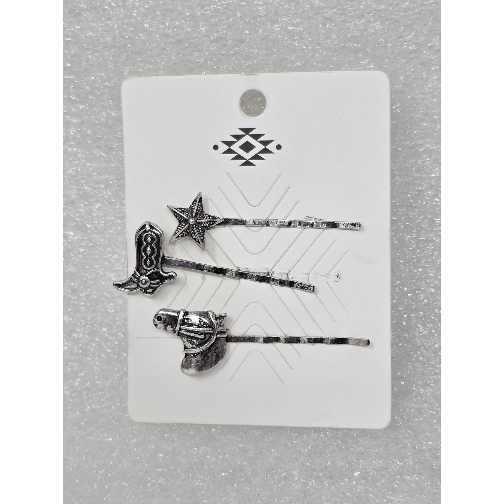 Western-Themed Hairpin Set With Boot Star & Cowboy Hat Designs Silver Tone